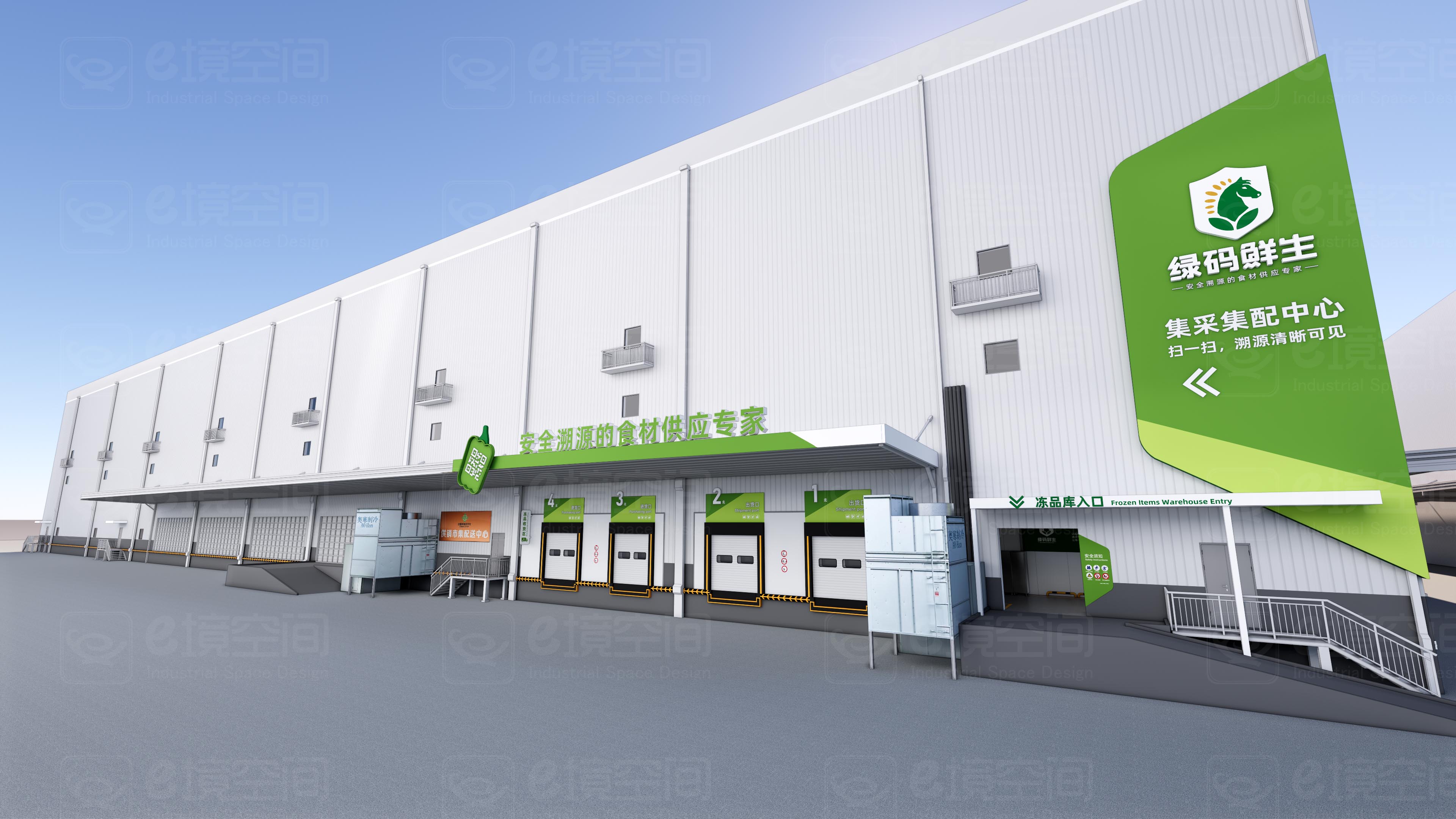 色彩**:以“白+绿”为主色调,白色基底象征洁净高效的生产环境,鲜绿色点缀呼应生鲜行业属性,形成冷调工业感与生命力的平衡;