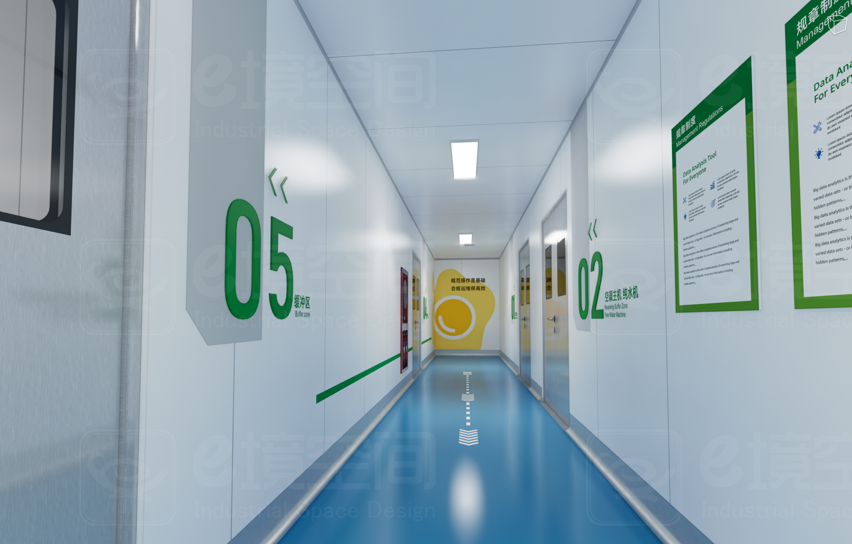 色彩心理学应用:以"白+绿"为主色调,白色基底强化无菌感知,绿色渐变墙面隐喻食材从田间到餐桌的生命力。在高温杀菌区,采用暖橙色渐变地面投影,通过色彩温度暗示降低游客对高温设备的恐惧感。
