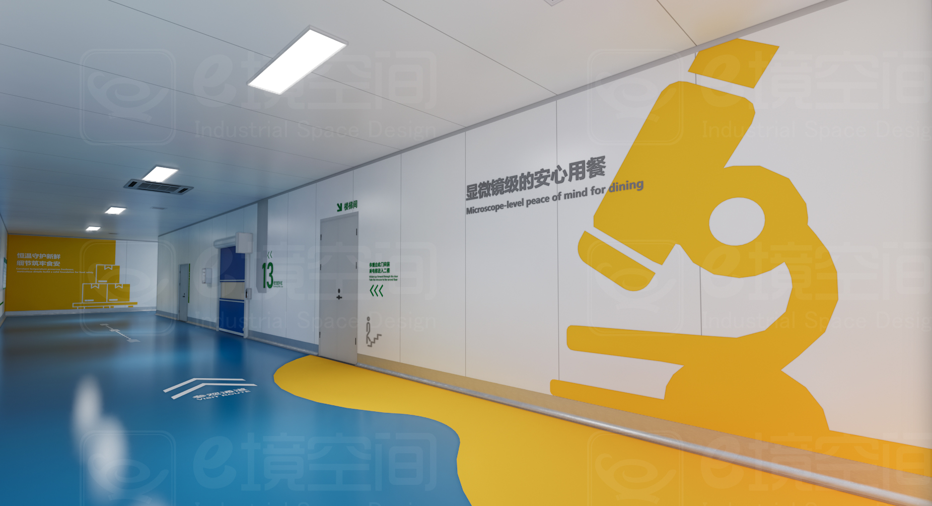 微观意象宏观化:显微镜镜头造型被解构为导视牌、地面标识甚至设备装饰纹样。在留样区,巨型显微镜雕塑内部嵌有LED屏,实时显示当日食材的微生物检测数据,将抽象的"菌落总数"转化为直观的视觉语言。